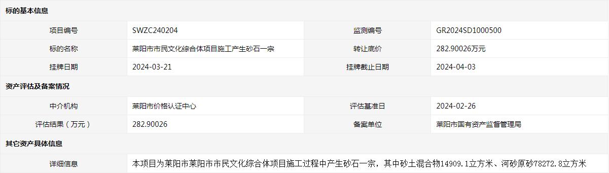 萊陽市市民文化綜合體項(xiàng)目施工產(chǎn)生砂石一宗