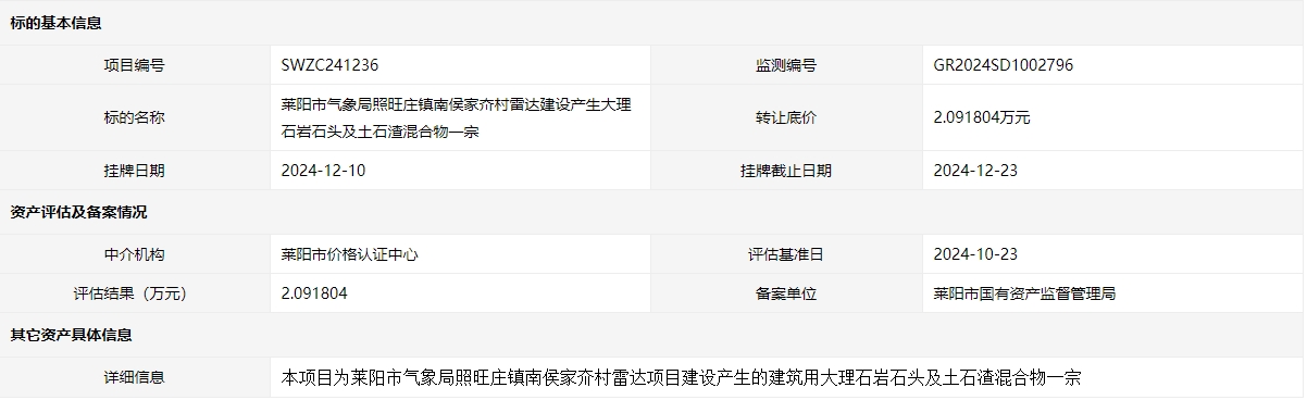 萊陽市氣象局照旺莊鎮(zhèn)南侯家夼村雷達建設(shè)產(chǎn)生大理石巖石頭及土石渣混合物一宗