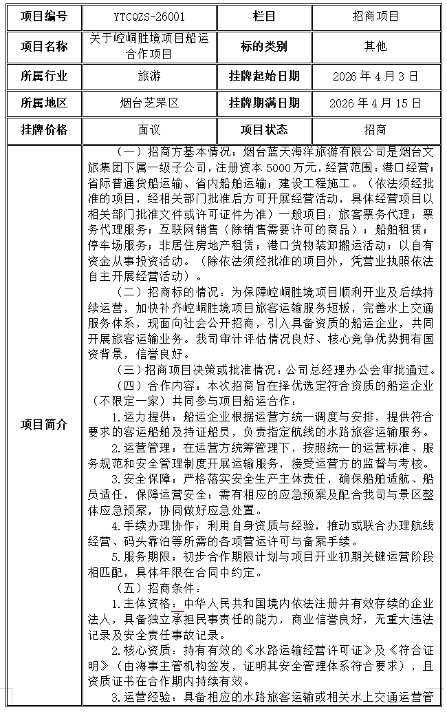 關(guān)于崆峒勝境項(xiàng)目船運(yùn)合作招商項(xiàng)目
