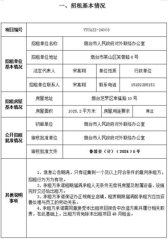 煙臺市南大街267號一樓東側(cè)門頭房招租公告