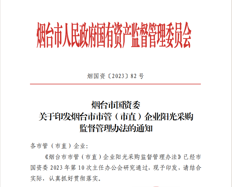 2024年6月30日,煙臺(tái)市國資委正式發(fā)布《煙臺(tái)市市管(市直)企業(yè)陽光采購監(jiān)督管理辦法》(以下簡稱:《管理辦法》),對進(jìn)一步加強(qiáng)國有企業(yè)陽光采購工作作出部署安排。